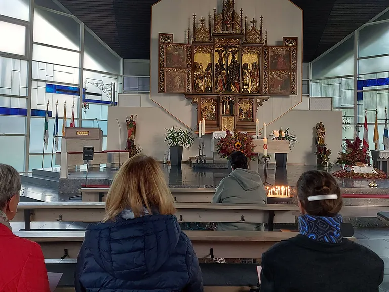 Kerzenlicht erhellt den Raum. Aus dem Alltag eintauchen in Licht und Wärme. Mit Rosen den Marienaltar schmücken. Atmen und singen. Hören und beten. Sitzen und stehen vor Gott...