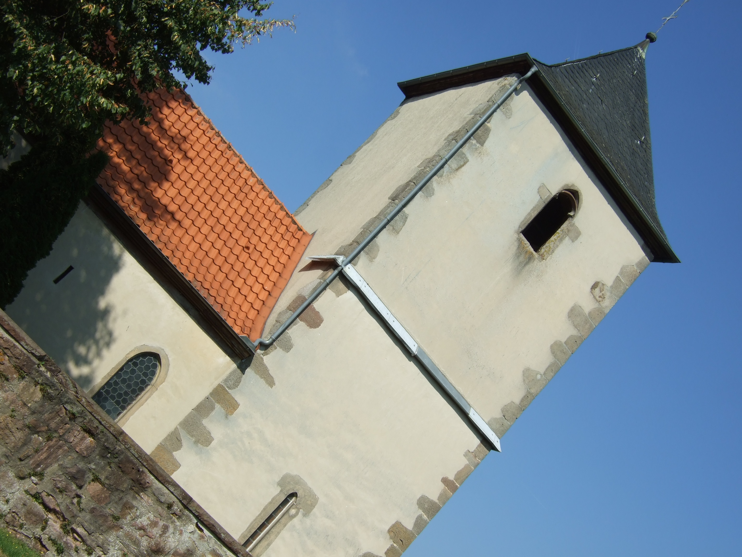 Im Osten schließt sich der quadratische Turm an. Die Grundfläche der kleinen Kirche beträgt nur 14,72 m Länge und 5,60 m Breite. Mehr als ein Drittel der Grundfläche nimmt der Turm ein. Statt Fenster besaß der Altarraum im Turm spitzbögige Lichtschlitze im frühgotischen Stil, die auch als Schießscharten verwendet werden konnten.