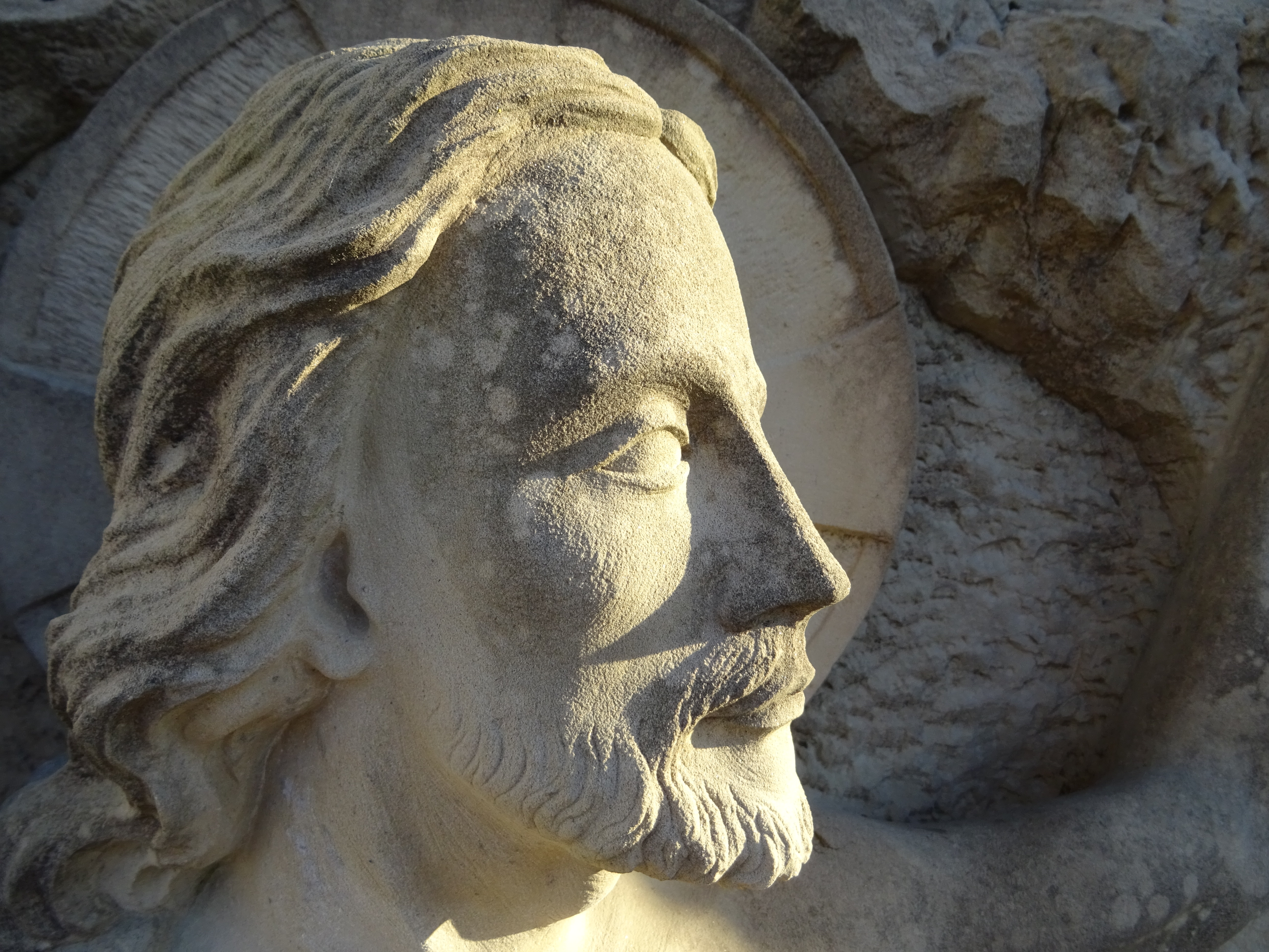 Vor dem Eingang der Auferstehungskirche empfängt die Menschen eine Sandsteinfigur des Auferstandenen des Künstlers Bertram Wawera.